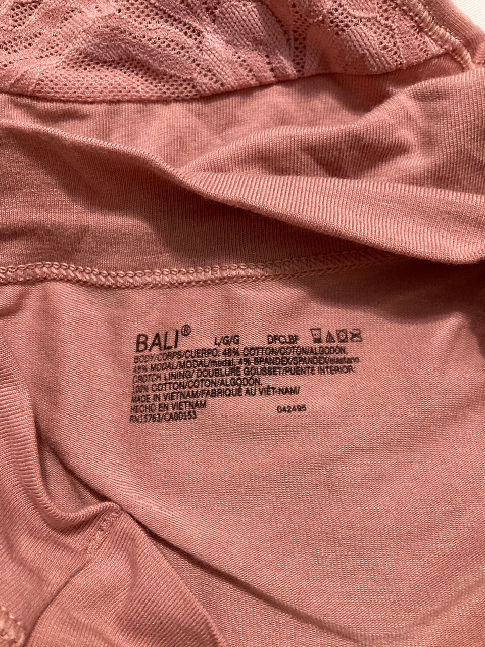 The Bali Breathe Lace High-Waist Brief in ROSE L is a stylish and comfortable panty designed for women. Made with a solid pink color and lace fabric, this high-rise brief offers a flattering fit and gentle compression at the waist. Machine washable for easy care, this opaque brief is perfect for everyday wear. Branded with Bali, this panty in size L is a lovely addition to any lingerie collection, featuring a classic rose theme.