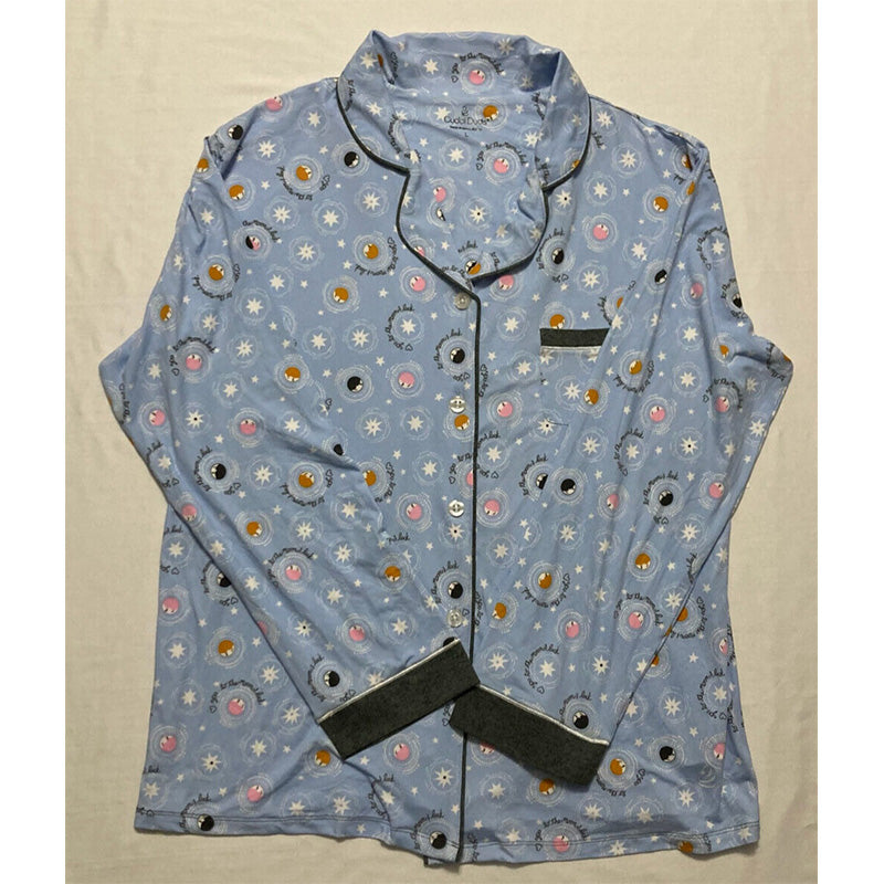 - Top: hits at hip; soft fabric; pocket at left chest; contrast piping; notch collar; front button closure; long sleeves