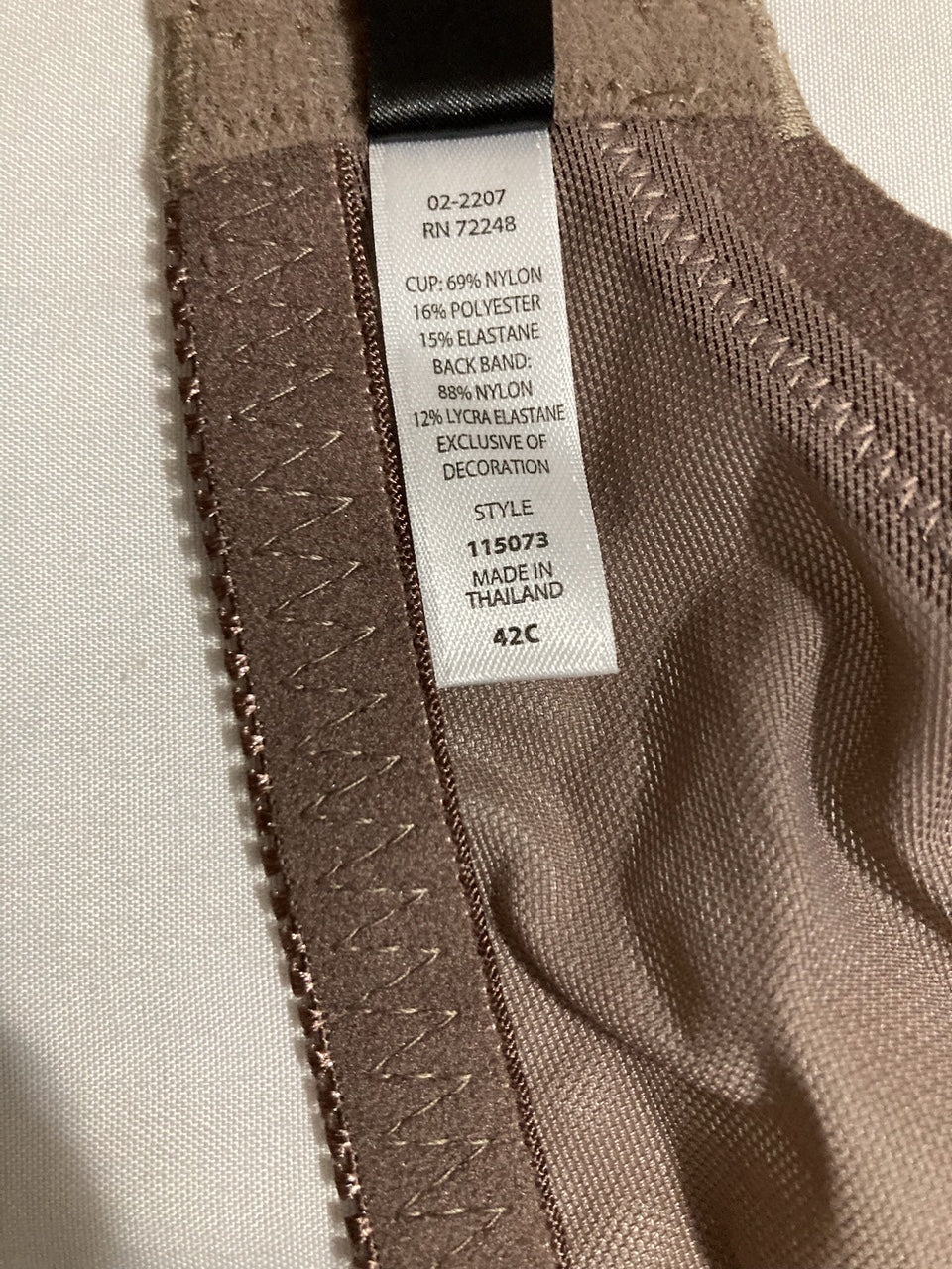 The FELINA Paramour Peridot Lace Full Coverage Unlined Bra in MINK 42C is a stylish and comfortable lingerie option for women. This underwired bra features a solid beige color with a hook & eye closure for a secure fit. The full coverage and unlined design provide both support and a seamless look, making it suitable for everyday wear. Hand wash only to maintain the quality of this Felina brand bra, perfect for adding a touch of elegance to your intimates collection. Made in Thailand, this bra offers a touch of luxury with its opaque lace detailing.