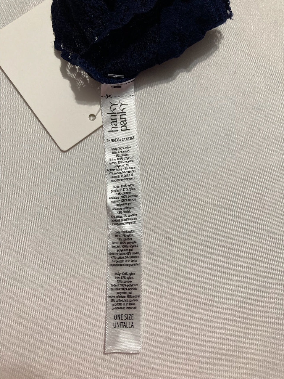 The HANKY PANKY Signature Lace Leakproof Original Rise Thong in navy blue is a stylish and comfortable panty designed for women. With a low rise and thong style, this one size thong is made of lace fabric for a feminine touch. Hand wash only to ensure longevity and quality. Perfect for those looking for a sexy and practical panty option, this Hanky Panky thong is a timeless classic in the intimates and sleep department.
