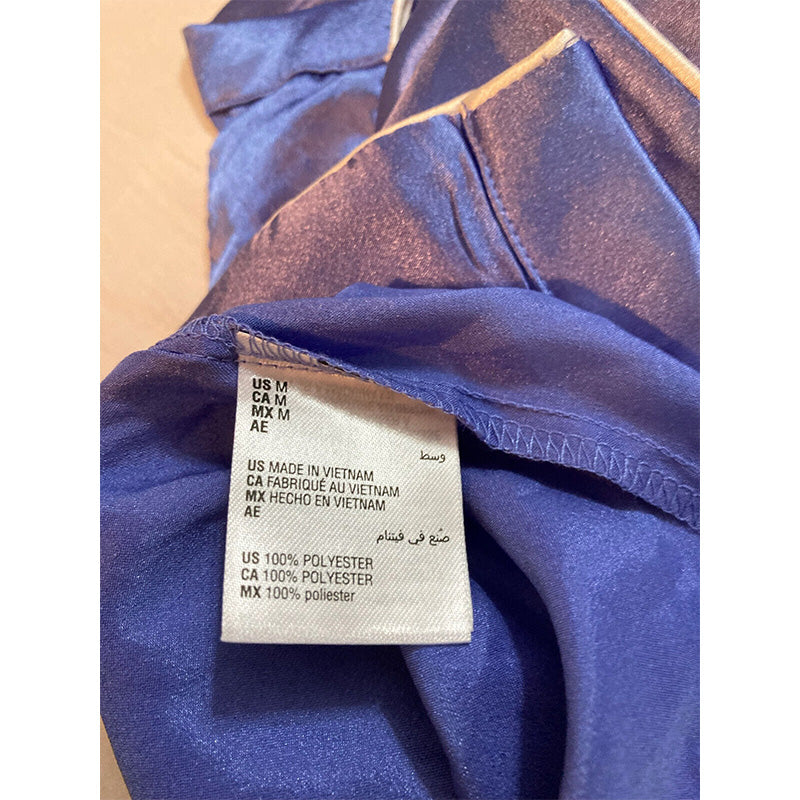 Top: hits at hip; pocket at left chest; piping trim; notched collar; button-front closures; short sleeves