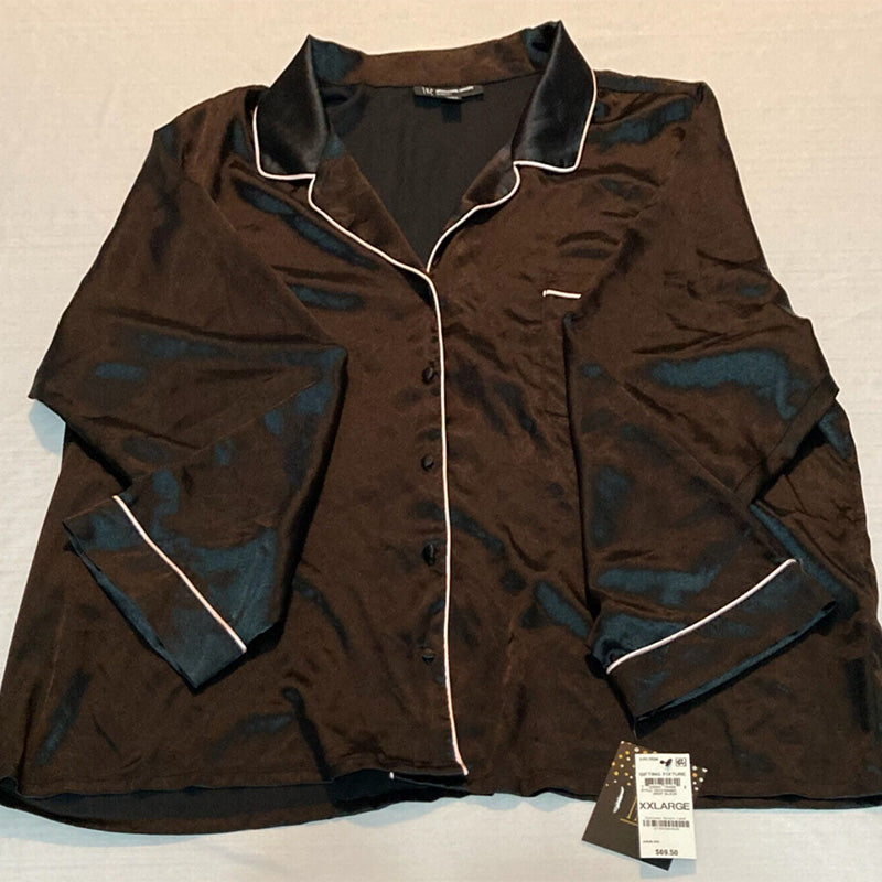 - Top: hits at hip, piping trim at notch collar, center front, left chest patch pocket and long sleeve cuffs