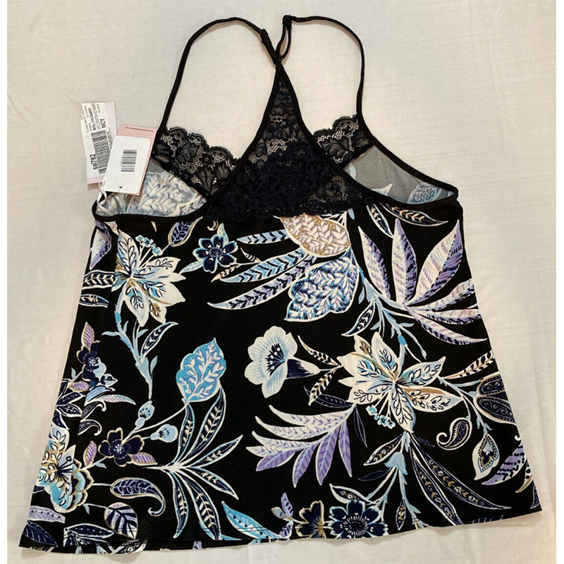 - Top: hits at hip, knit fabric, lace racerback, lace-trim V-neck, pullover styling, spaghetti straps