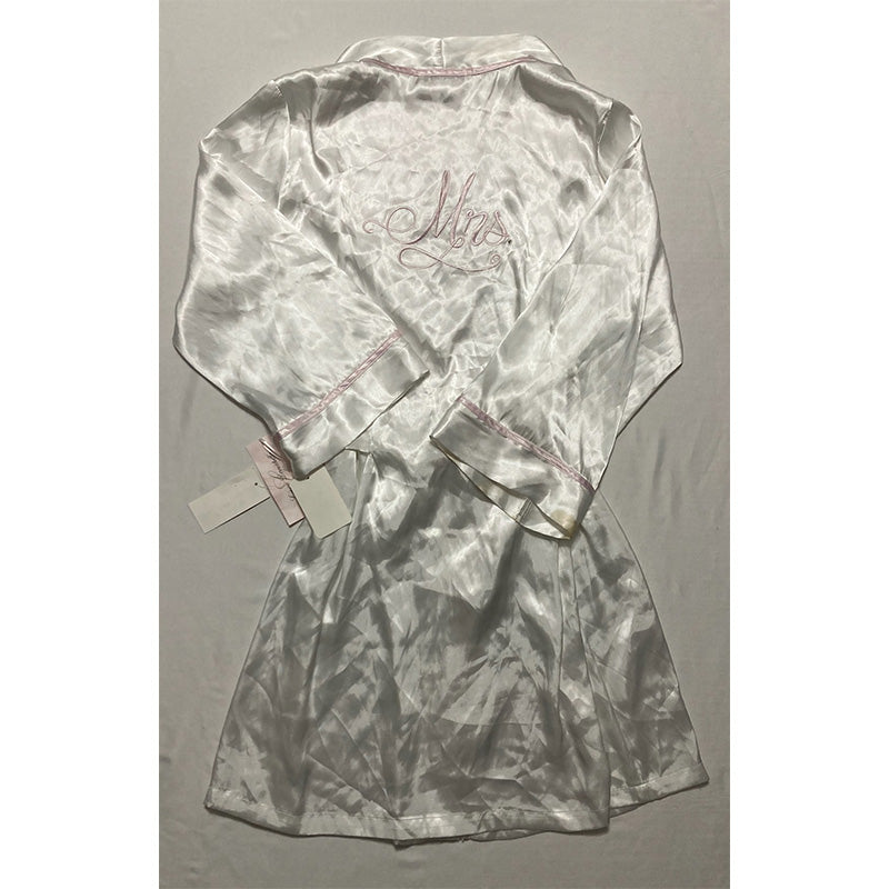 - Wrap robe features contrast-trimmed shawl collar, attached tie belt at waist, "Mrs" embroidered in contrast script at the back and long sleeves with contrast-trimmed cuffs; hits above knee