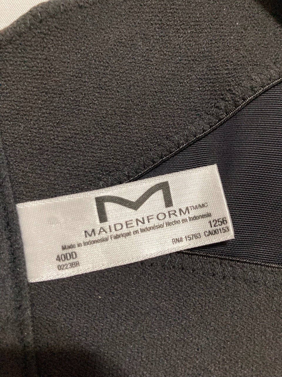 The product is a Maidenform shapewear bodysuit in black, size 40DD. It features a solid pattern, underwired support, firm compression, and is made of nylon material. The bodysuit is designed for the body with a focus on the strap accents, and it is a one-piece style. It is intended for women looking for shapewear with a regular fit and opaque appearance.