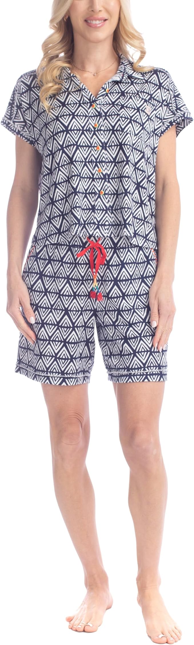 This OCEAN PACIFIC Summer Lovin Pajama Set in blue geometric design is perfect for the summer and spring seasons. The set includes a button-down shirt and sleep shorts, both made from lightweight polyester material. The shirt features short sleeves and a button closure for easy wear. The set is machine washable and available in size XL, making it comfortable for a good night's sleep. Made by the brand OCEAN PACIFIC, this pajama set is a stylish and practical addition to any woman's sleepwear collection.